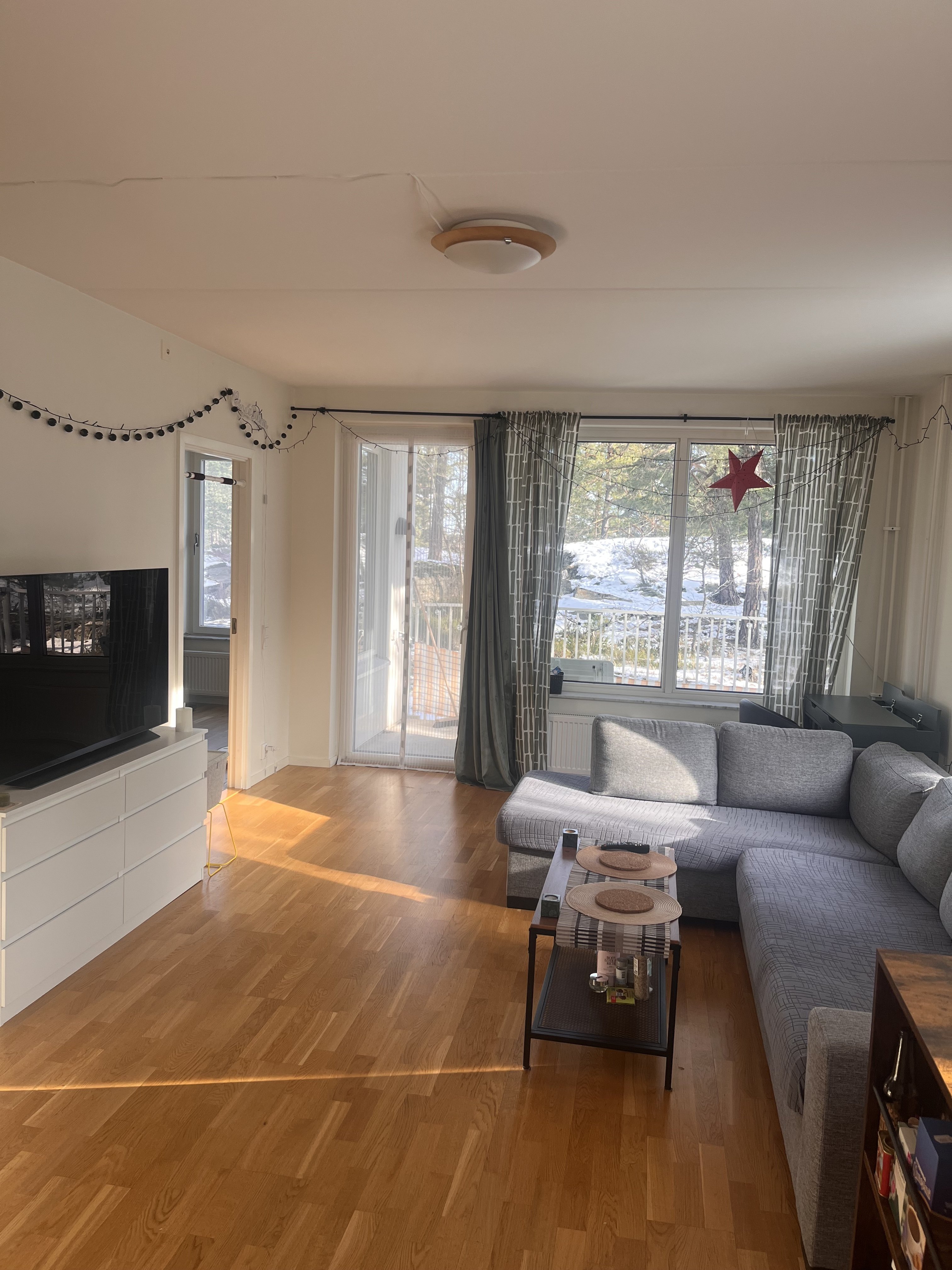 Möblerad 2:a i Älta – ca 30 min till Stockholm C Nu finns möjlighet att hyra en trivsam och välplanerad 2:a i lugna Älta. Buss går precis utanför och du tar dig till centrala Stockholm på cirka 30 minuter. Lägenheten hyrs ut i andra hand på grund av arbete. Bostaden är fullt möblerad (soffa, stor säng, TV, köksutrustning, 2 olika skrivbord (Ett är höj och sänkbart skrivbord) och mer). Tvättmaskin och torktumlare finns i badrummet. Hyra & kostnader Grundhyra: 11 835 kr/mån Bredband: 449 kr/mån El och vatten debiteras enligt faktisk förbrukning. Uthyres från mars eller april (med godkännande från Wallenstam). Minsta hyrestid: 6 månader. Söker skötsam och ansvarsfull person eller par med stabil ekonomi.